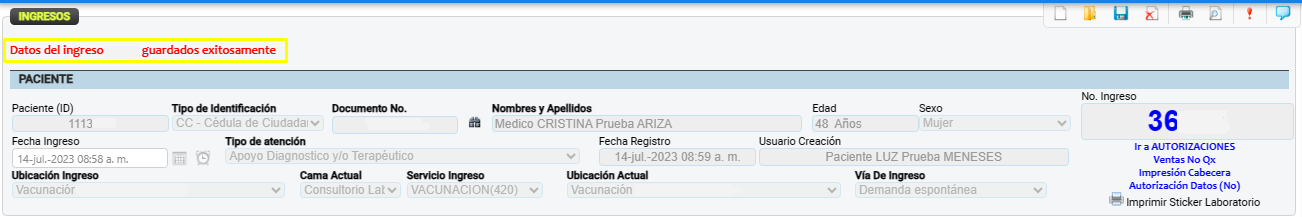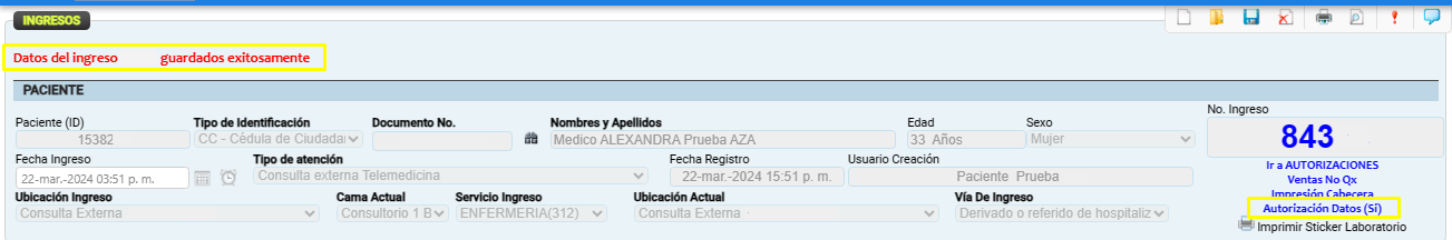 Una vez se diligencie el formulario y se vuelva hacer clic en guardar para crear el ingreso, se actualizará la opción autorización de Datos y se creara el ingreso
