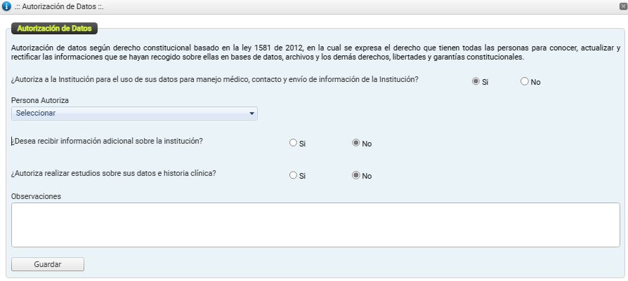 "¿Autoriza a la institución para el uso de sus datos para manejo médico, contacto y envío de información de la institución?"