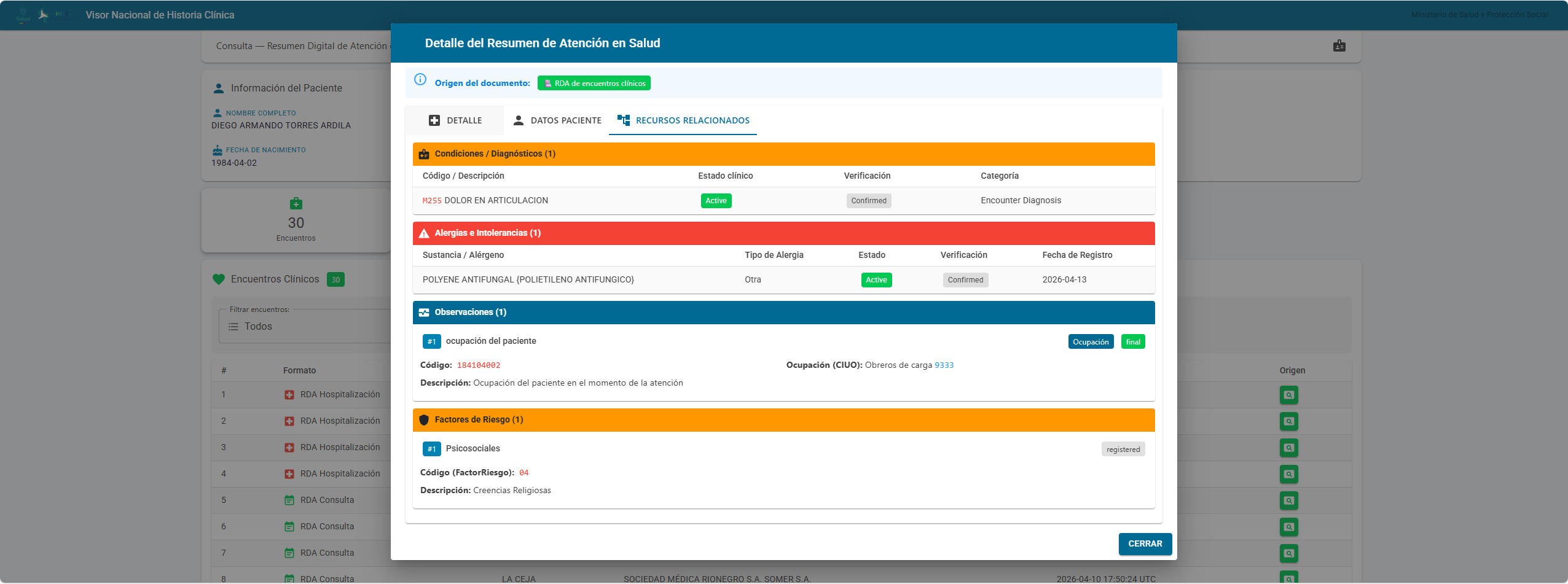 4 funcionalidades: Registro de antecedentes en la historia clínica, antecedentes en consulta médico ocupacional y vacunación, visor RDA |