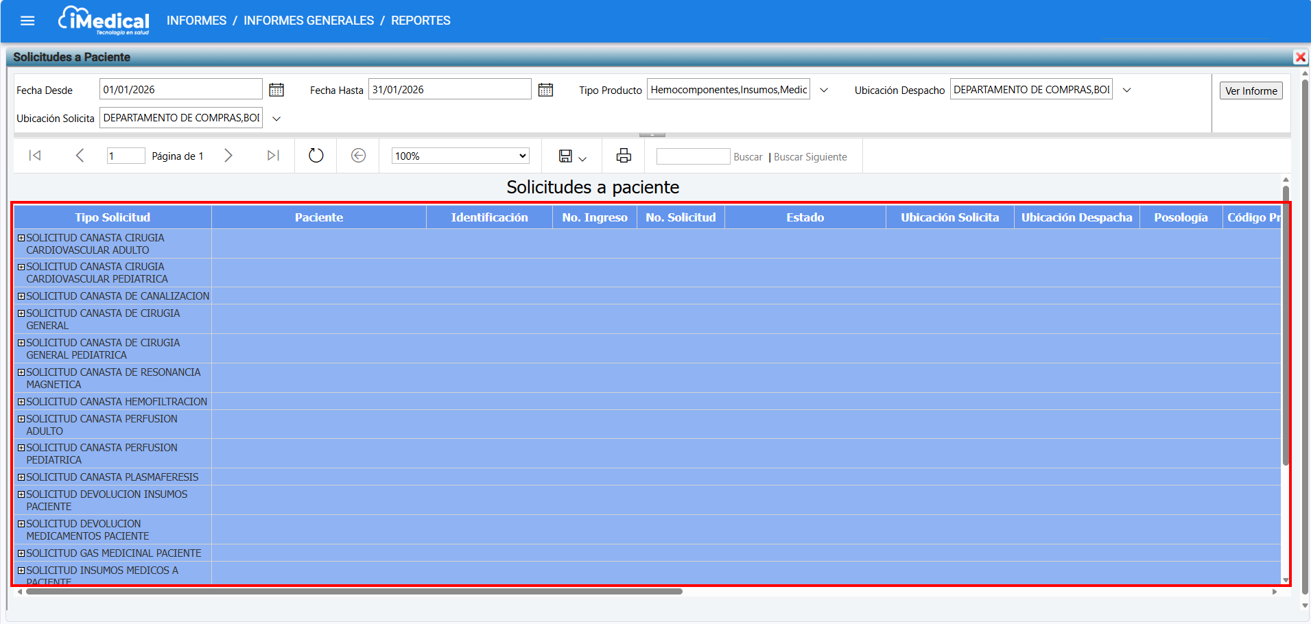 📍 Ruta: Informes / Reportes / Inventarios / Solicitudes a Pacientes