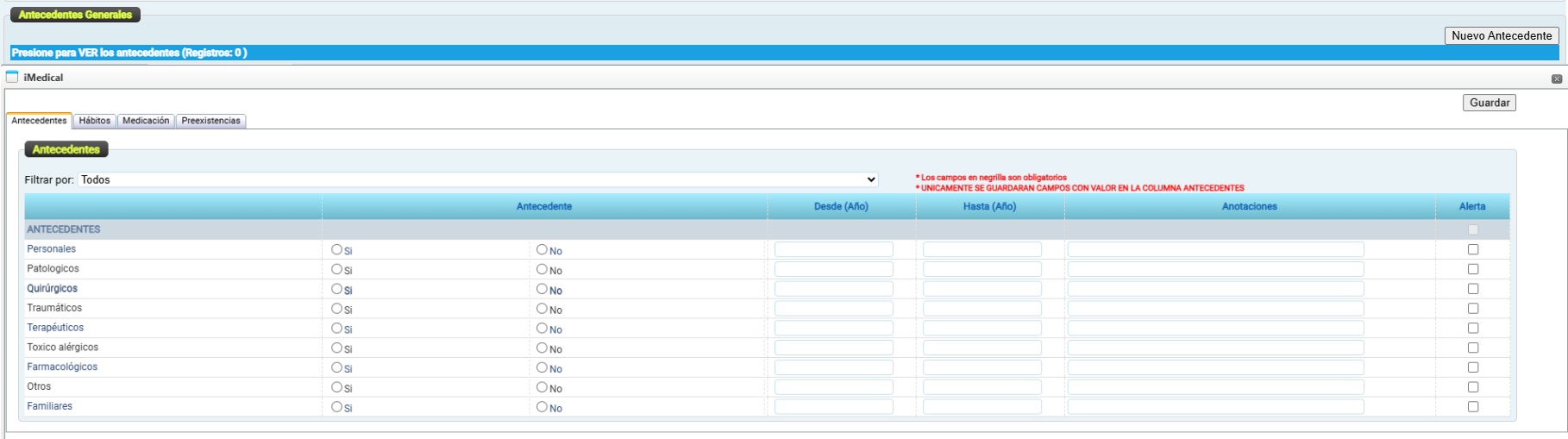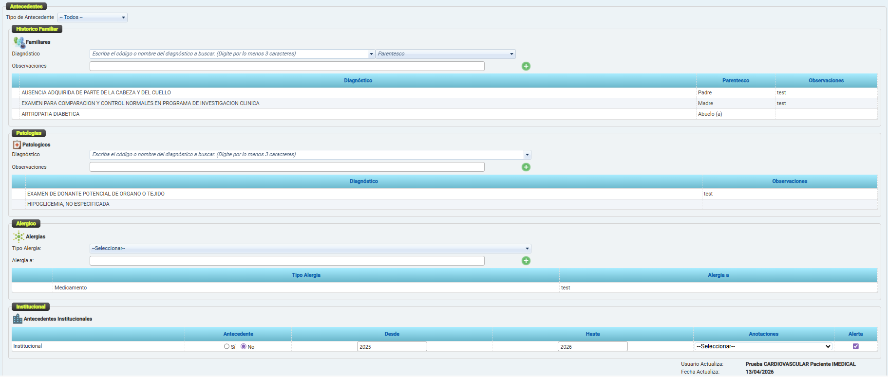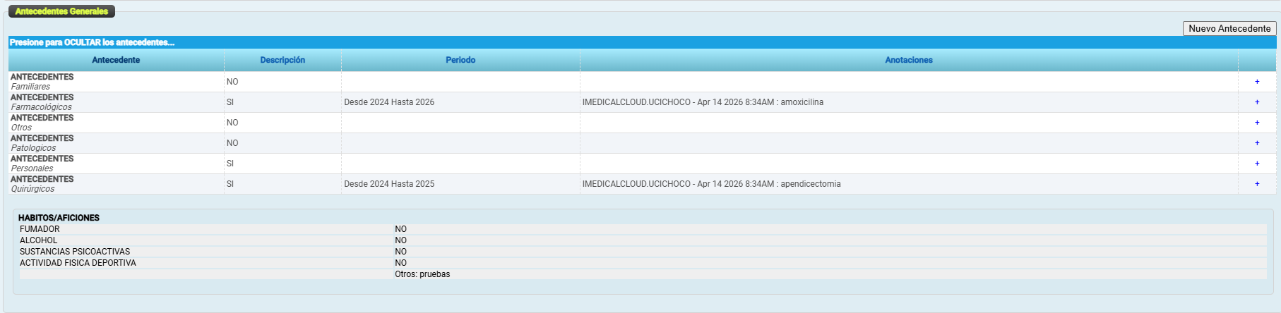 Adicionalmente, el sistema organiza el registro de antecedentes bajo una estructura estandarizada por categorías clínicas, facilitando su captura, consulta e interoperabilidad: