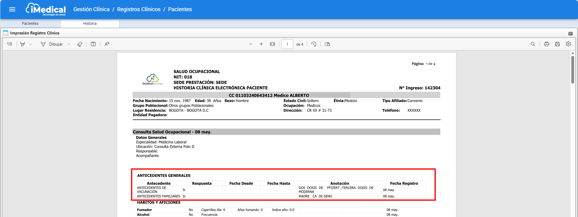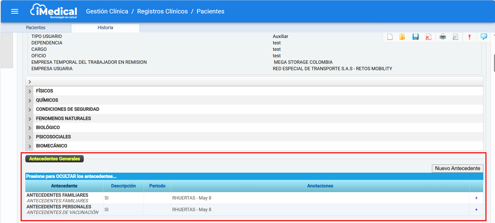 📍 Ruta: Gestión Clínica / Registros Clínicos / Pacientes | Actividad Consulta Salud Ocupacional