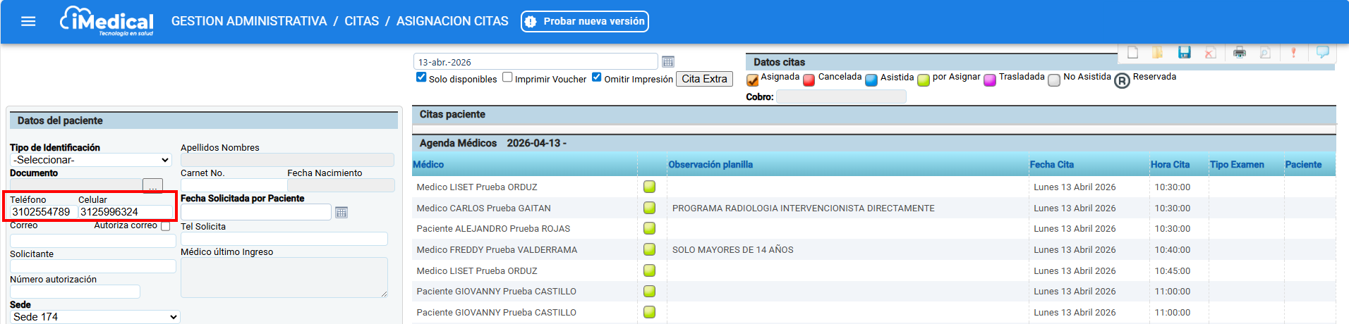 ℹ️ Nota: La mejora en los campos Teléfono y Celular aplica para las dos versiones de la pantalla de asignación de citas. |