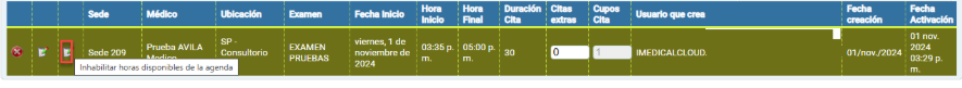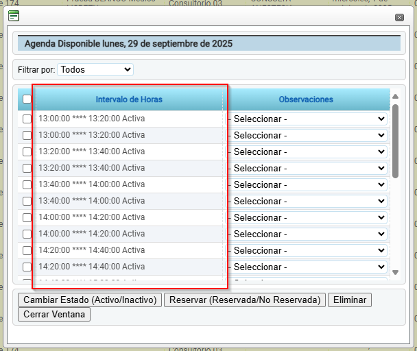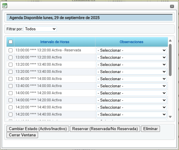 En la fila de la agenda seleccionada, haga clic sobre el ícono de lápiz y papel . Al hacerlo, se desplegará una ventana emergente con los intervalos de horas disponibles para dicha agenda.