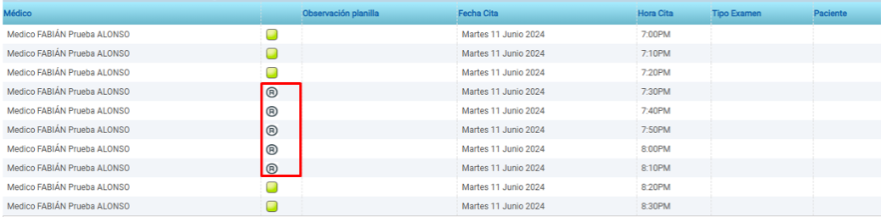 En el listado de agendas, identifique el registro correspondiente al médico, consultorio, fecha y tipo de examen donde desea realizar la reserva.