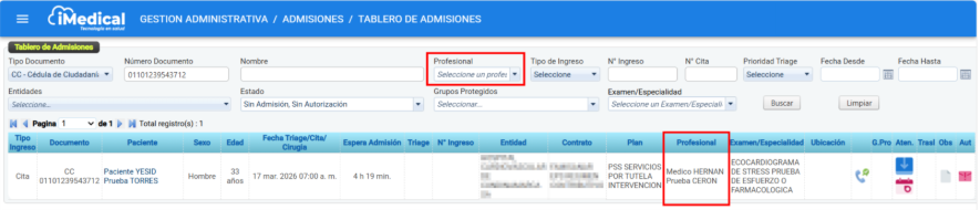 Profesional. En esta casilla puede filtrar la información por medio de los profesionales registrados. Está asociada con la columna de Profesional.