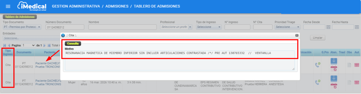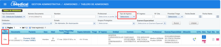 Tipo Ingreso: Muestra el tipo de ingreso dependiendo la condición del paciente: Triage, Cita o Cirugía.
