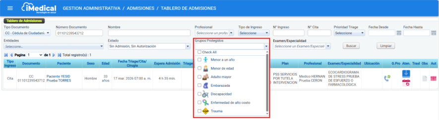 Grupos protegidos: Lista desplegable que permite clasificar un paciente dentro de un grupo protegido