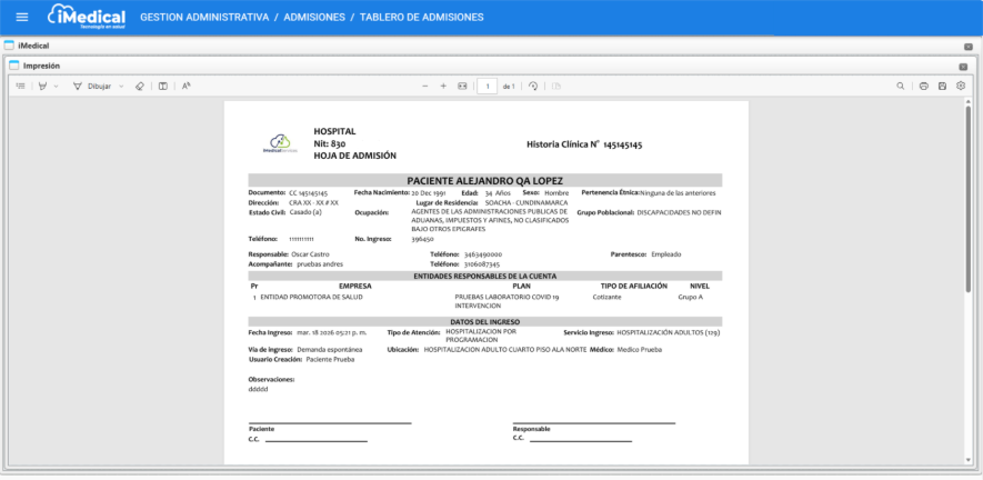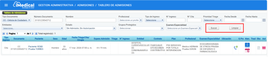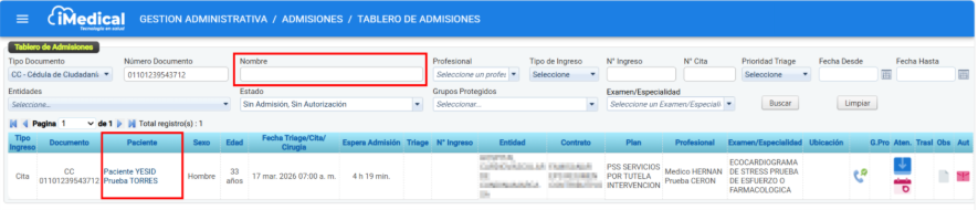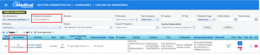 Documento: Mostrará el código del tipo de documento y la identificación del paciente.