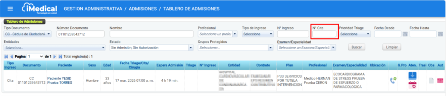 N° Ingreso: Mostrará el número de ingreso del paciente con el cual será atendido cuando se le realice su atención. En caso de no estar ingresado el paciente, el campo se mostrará vacío.