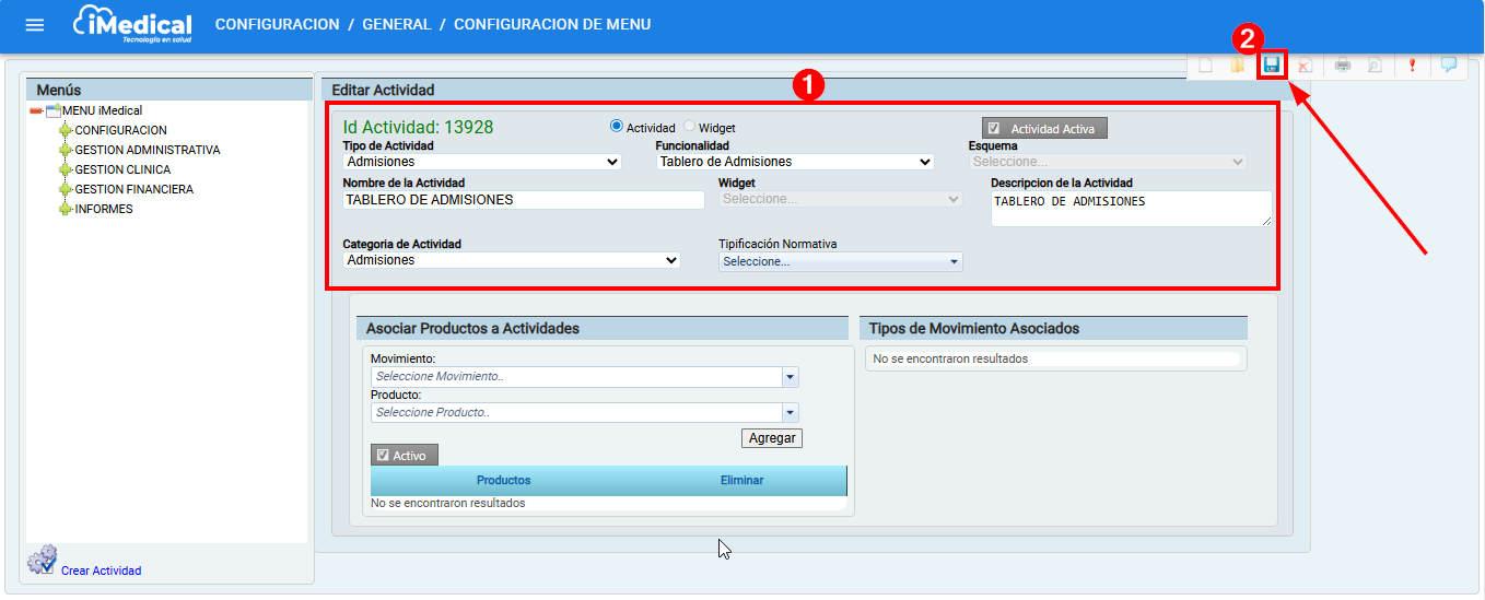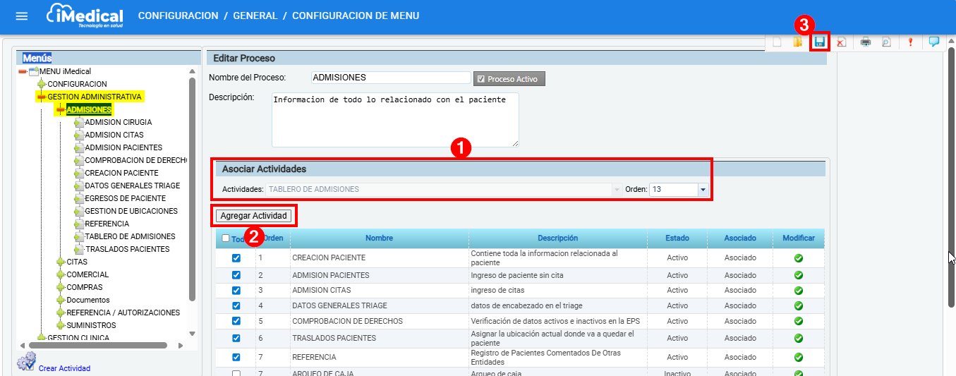 En este caso la asociamos a la Ruta: Gestión Clínica > Admisiones, pero el usuario la podrá asociar a la ruta que considere pertinente.