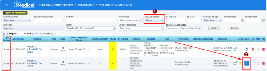 En el tablero de admisiones, encontraremos el ícono de descarga en la columna de atención (Aten.) en la fila correspondiente a cada paciente.