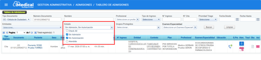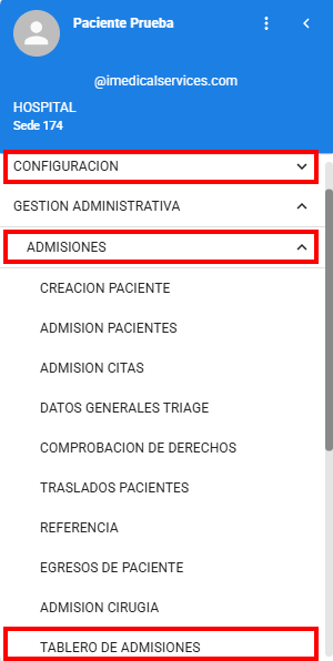 Ruta: Gestión Administrativa > Admisiones > Tablero de admisiones