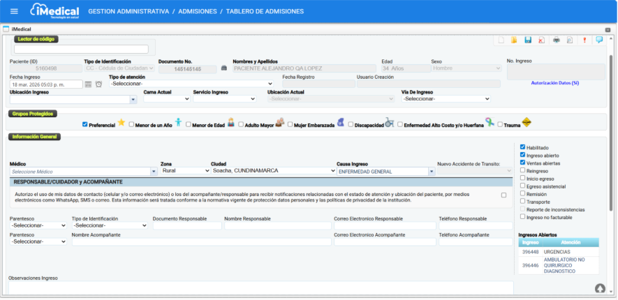 Para los pacientes de triage, el dato será tomado del diligenciamiento de la sección grupo protegido. Para los pacientes de citas y cirugía será tomado el dato de la sección de discapacidades en la creación del paciente.