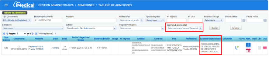 Examen/Especialidad: Mostrará el nombre del examen de la cita del paciente. Cuando el paciente sea de triage o cirugía, el campo se mostrará vacío.