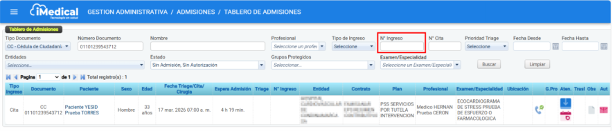 N° Ingreso. Es aquel que se le asigna a un paciente en la atención, puede escribirlo para filtrarlo.