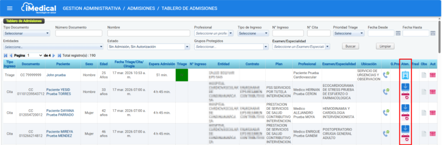 Columna de atención: Esta muestra si el paciente debe ser ingresado, está en atención o ya ha sido atendido