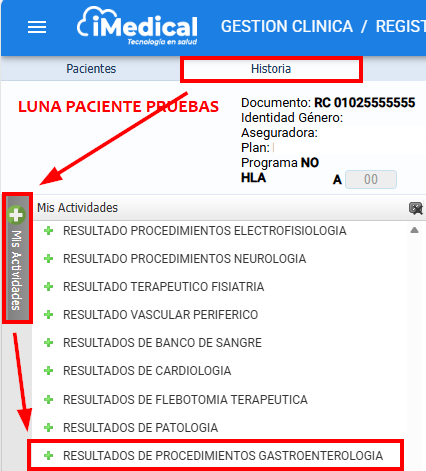 Una vez dentro de la historia clínica del paciente, siga la ruta: Mis actividades > Seleccione la actividad que requiera.