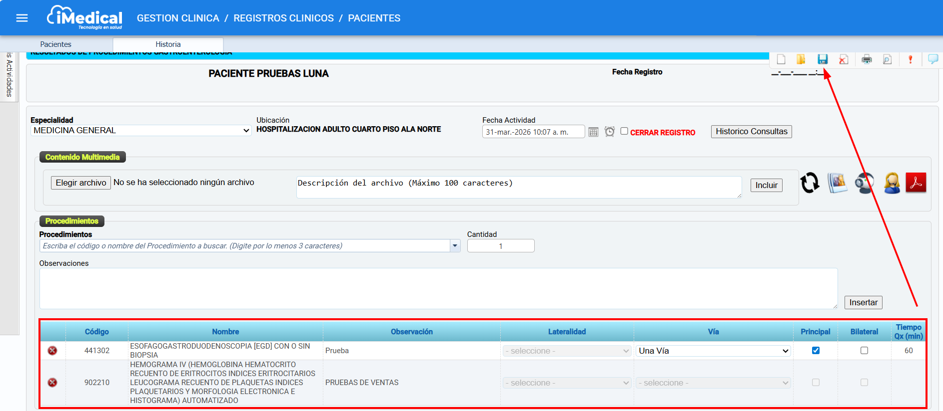 Una vez insertados los procedimientos Quirúrgico (QX) o No Quirúrgico (No QX) necesarios y completado el esquema correspondiente de la actividad seleccionada, de clic en el icono Guardar .
