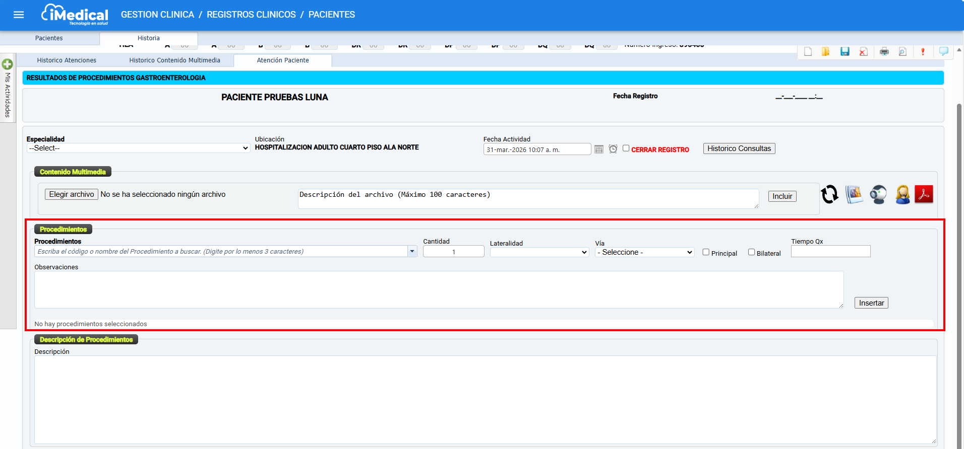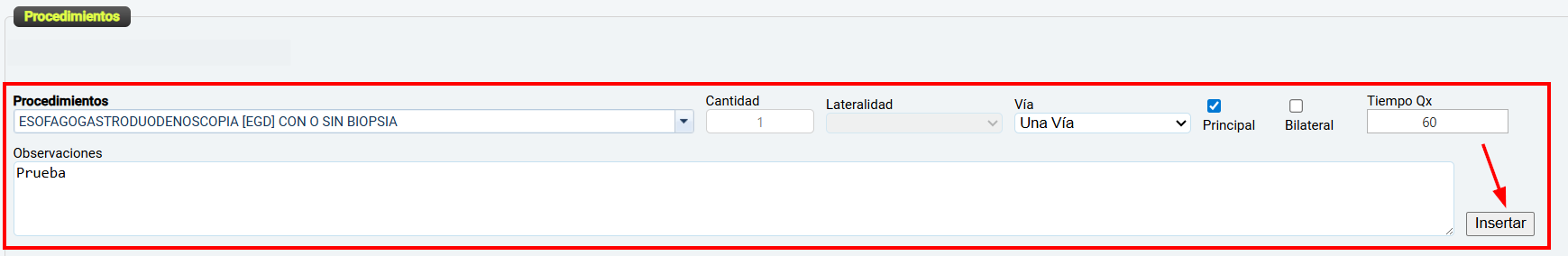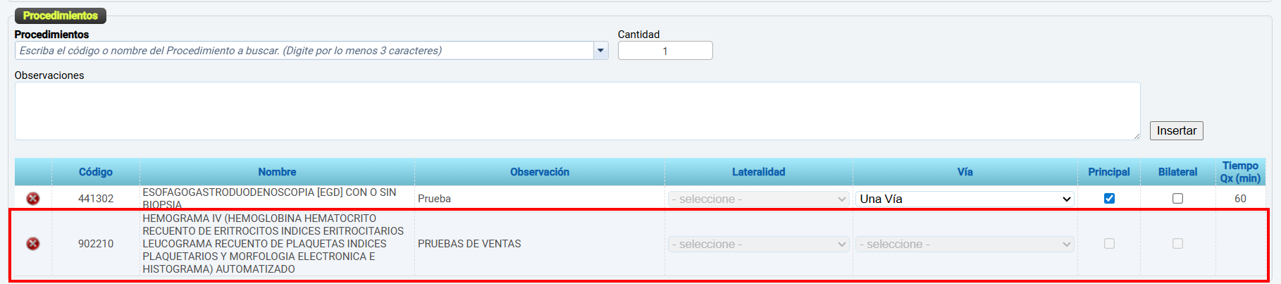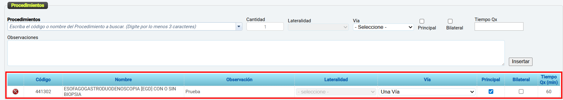Cuando se trata de un Procedimiento No Quirúrgico (No QX) el sistema solamente habilita los campos cantidad y observaciones, este último es de diligenciamiento obligatorio.