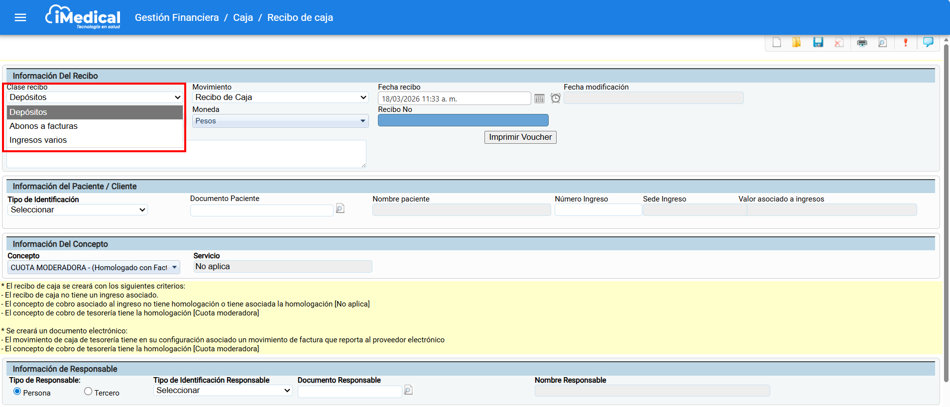 Diligenciamos la información del recibo. Hay varios tipos de recibo como lo son: