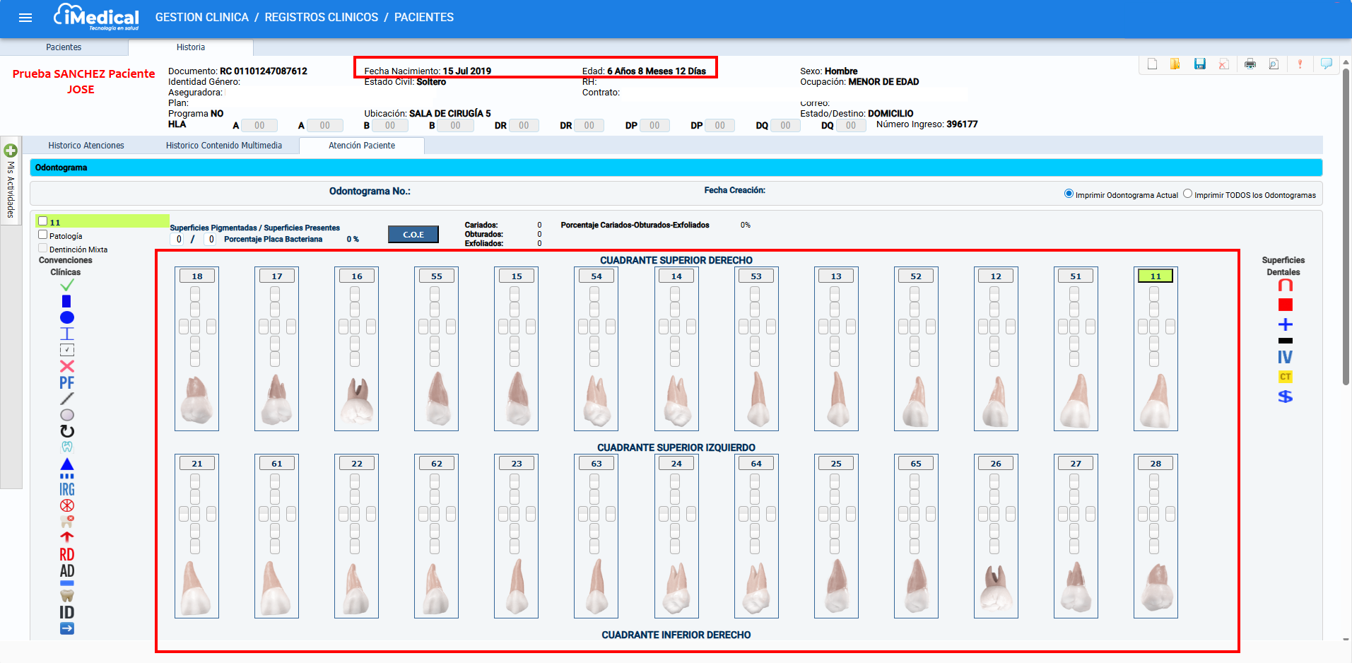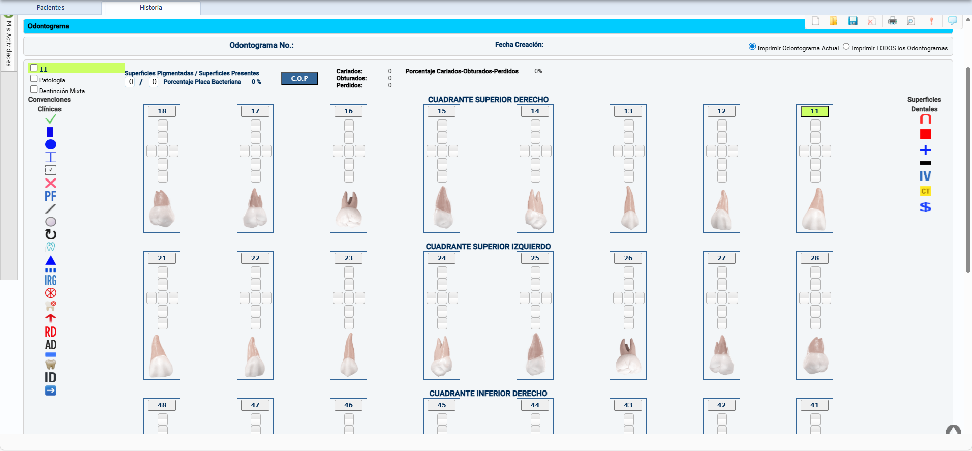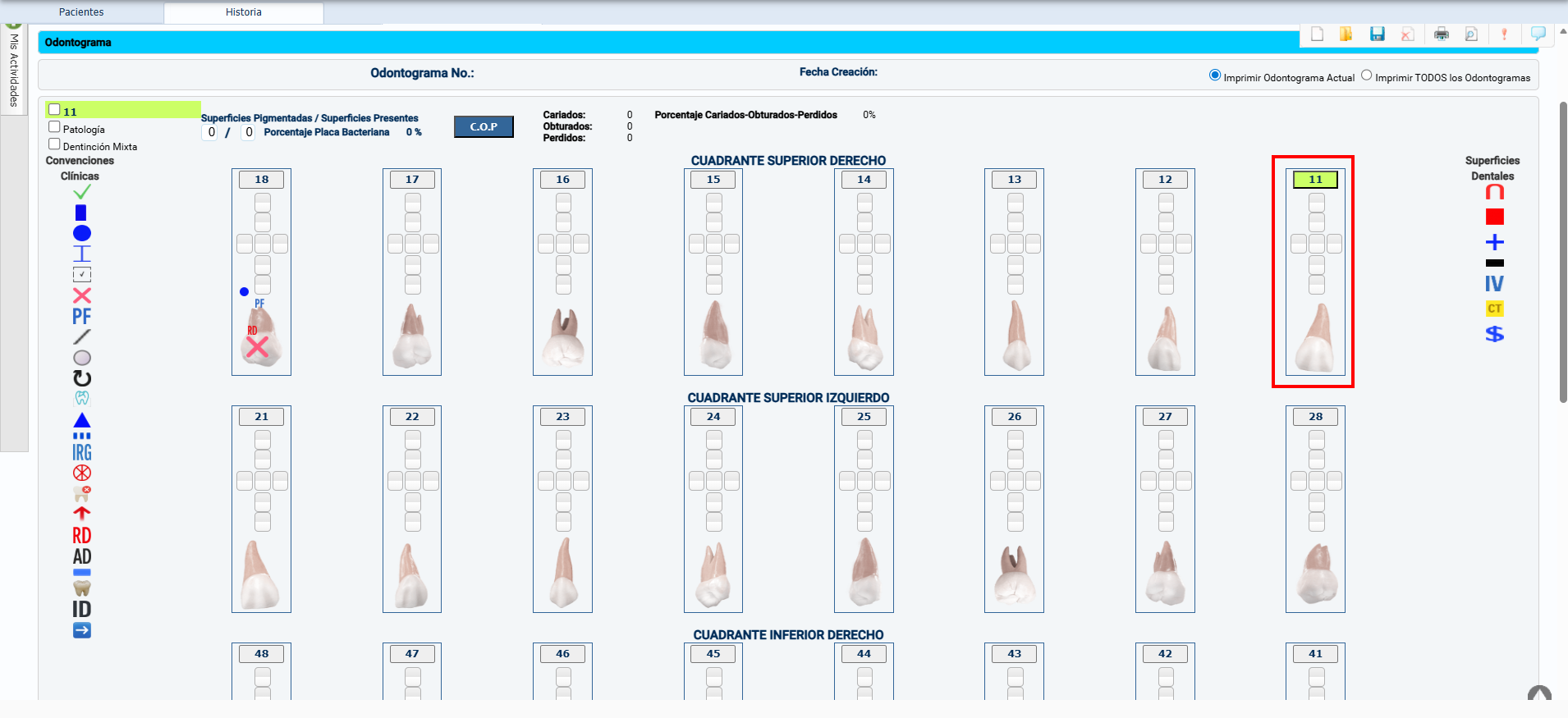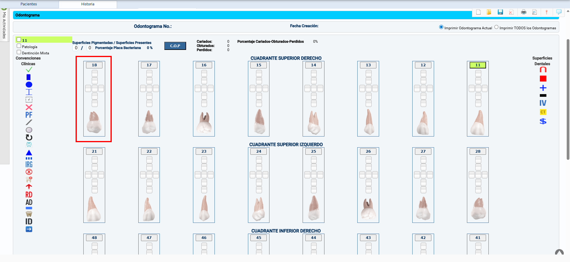 Nota. Debe tener en cuenta que el odontograma se carga automáticamente según la edad del paciente, mostrando el esquema correspondiente sin necesidad de configuración manual. Esta funcionalidad resulta especialmente útil en la atención pediátrica.