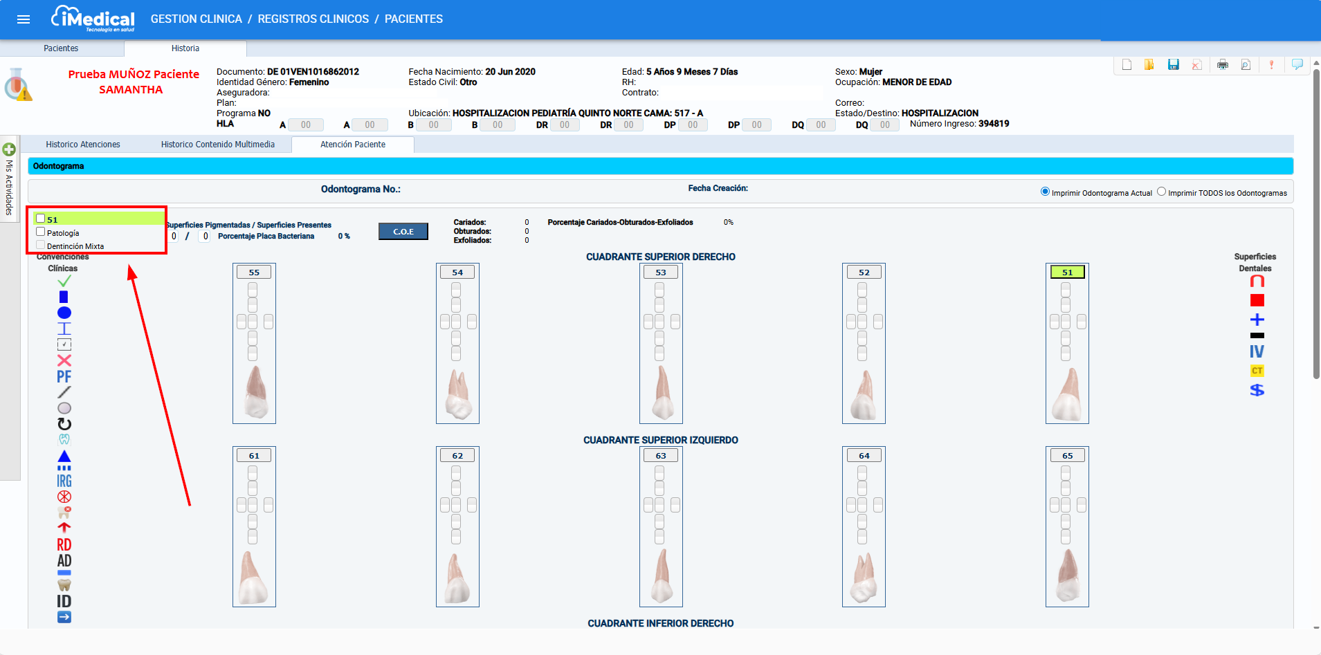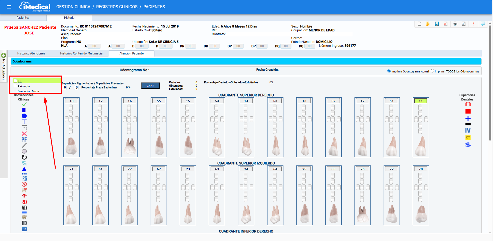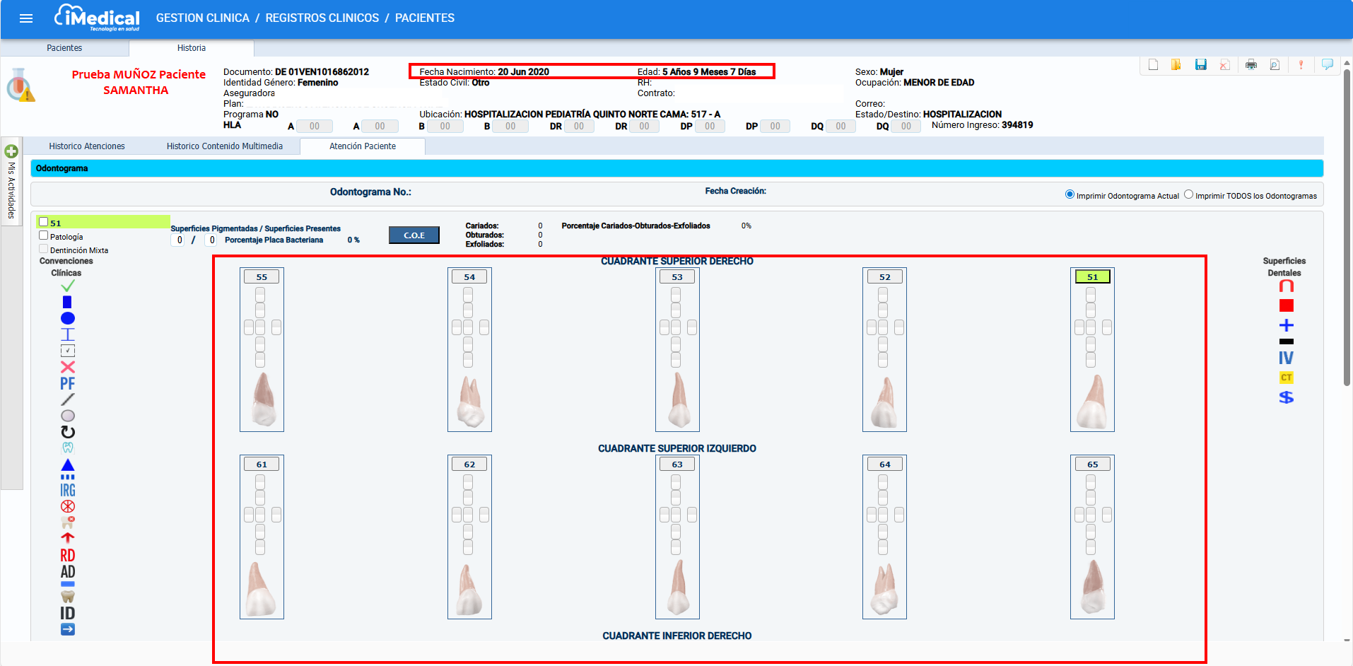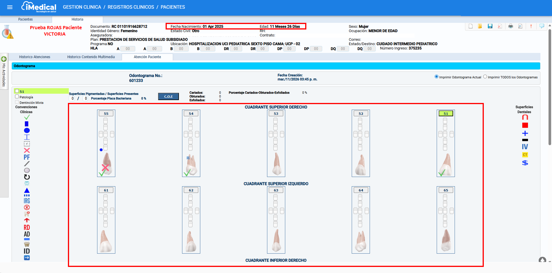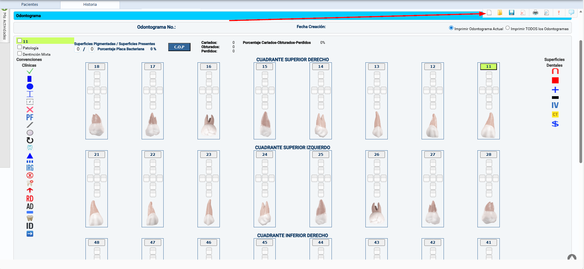 Nota. Debe tener en cuenta que el odontograma se carga automáticamente según la edad del paciente, mostrando el esquema correspondiente sin necesidad de configuración manual. Esta funcionalidad resulta especialmente útil en la atención pediátrica.