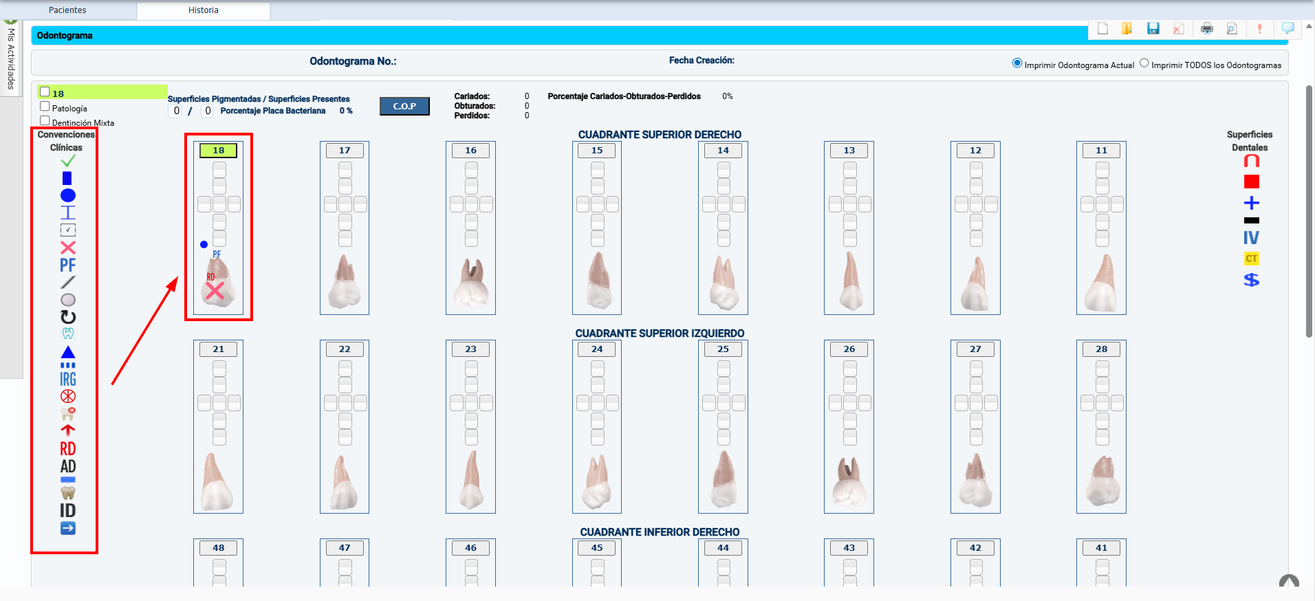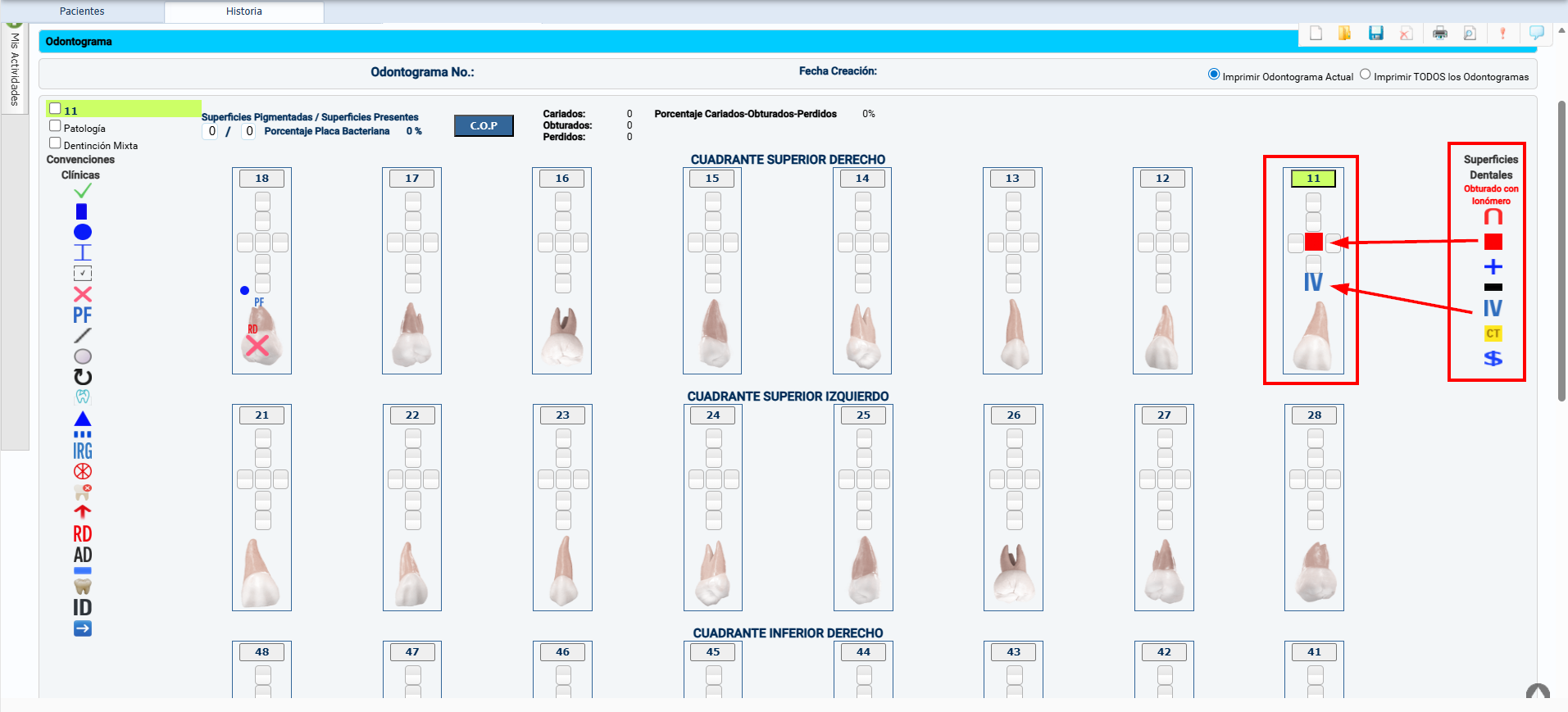 Una vez dado clic sobre la o las convenciones clínicas, estas se irán agregando dentro del diente seleccionado: