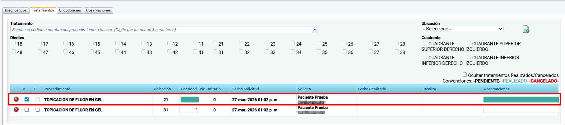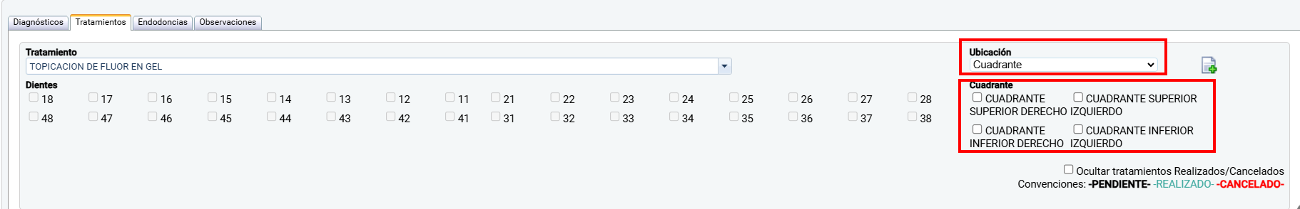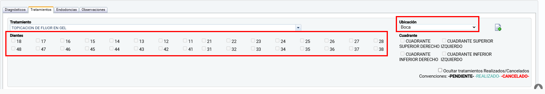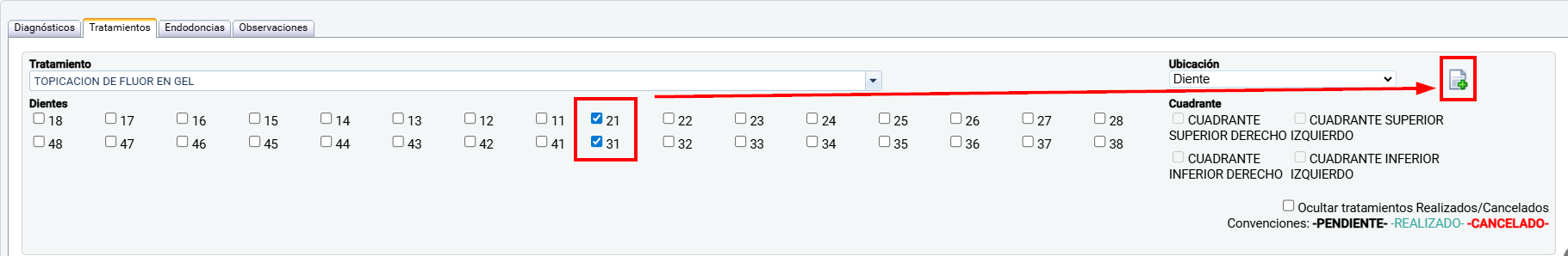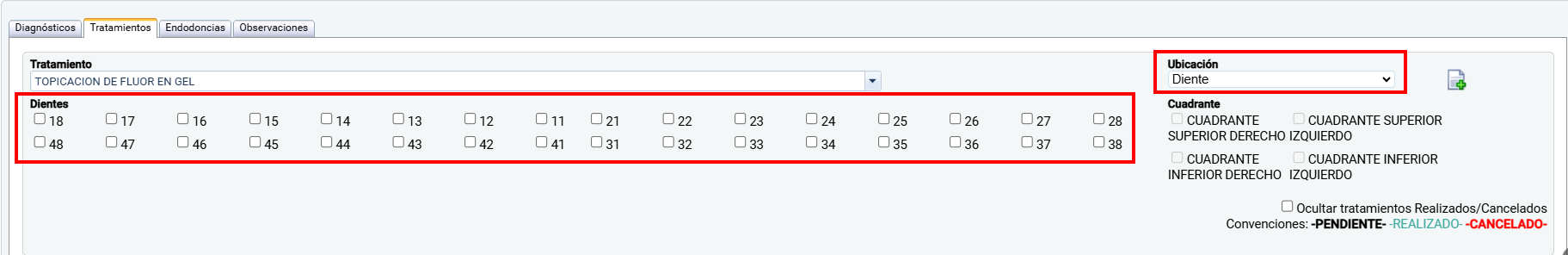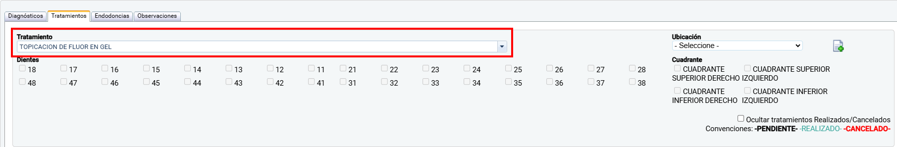 En la pestaña "Tratamientos", seleccione el tratamiento a realizar al diente en los siguientes campos: