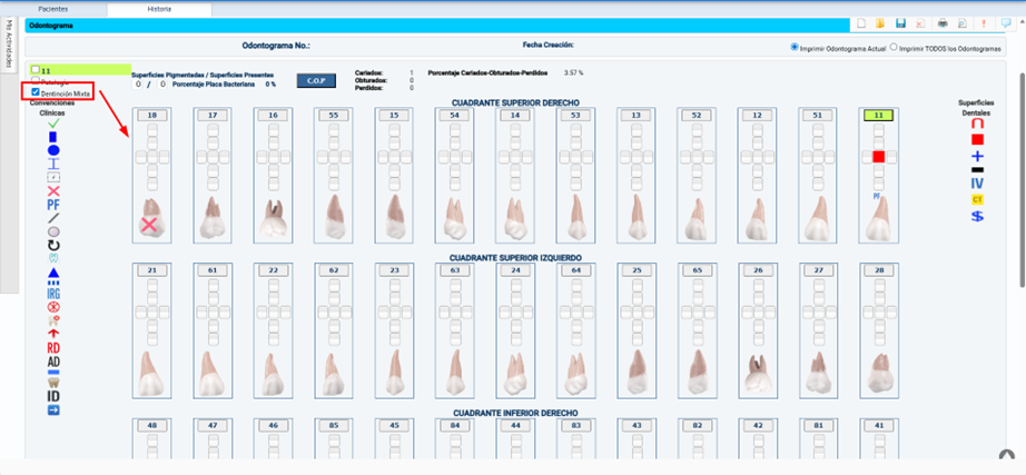 La pantalla del esquema de Odontograma, mostrará la Dentición mixta automática, en la cual se visualizan los dientes temporales (51–85) y permanentes (11-48).