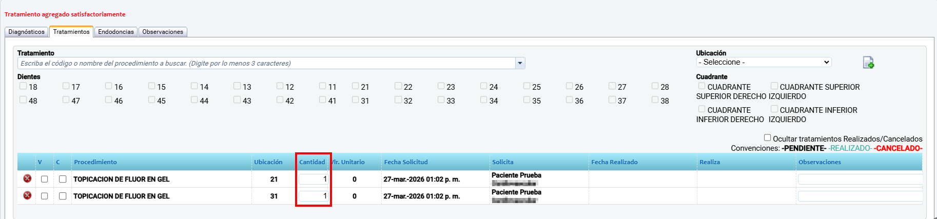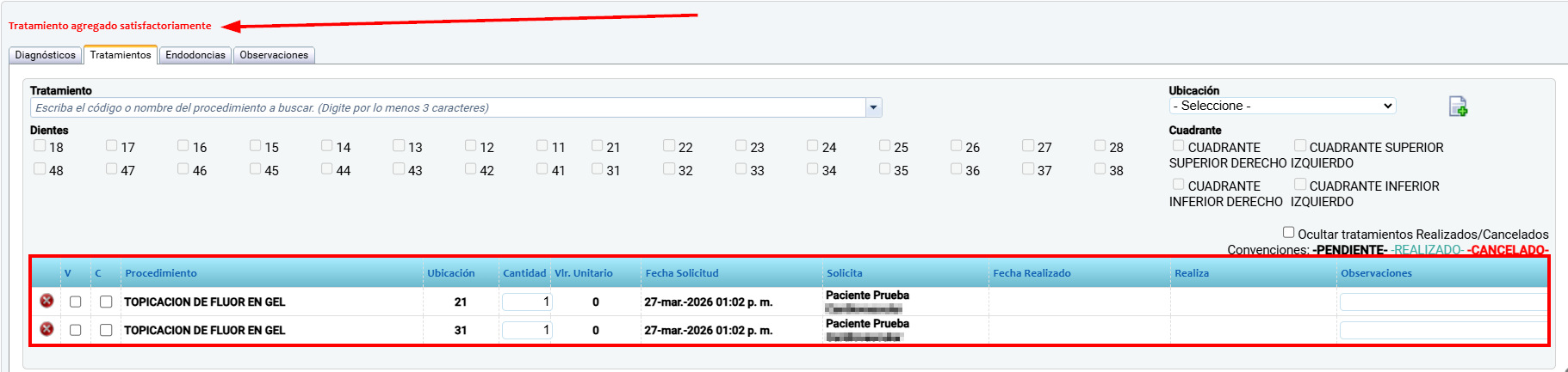 Al hacer esto, se agregan cada uno de los dientes seleccionados al tratamiento en una línea diferente.