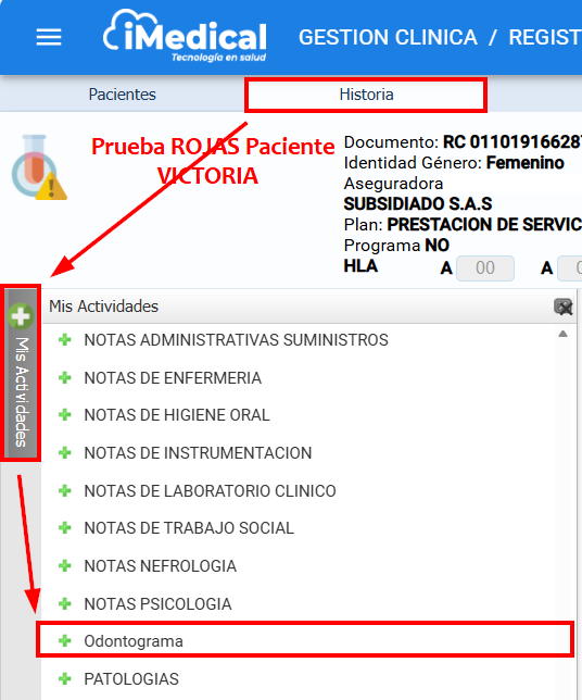 Al hacer esto, se habilita la pestaña "Historia", donde debe dar clic en Mis Actividades > Odontograma.
