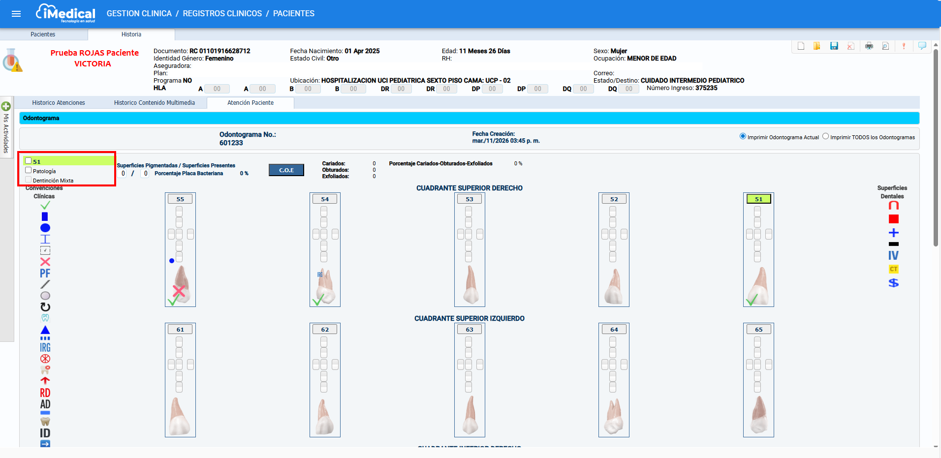 Una vez realizado este proceso, se habilita la pantalla del esquema de Odontograma, mostrando la Dentición temporal inicial, en la cual se visualizan únicamente los dientes temporales (51–85).