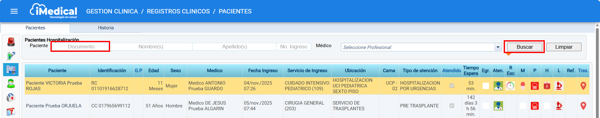 Al ingresar la ruta, se encuentra la siguiente pantalla. En la pestaña "Pacientes" de clic en el icono y busque o seleccione el paciente que se requiera.