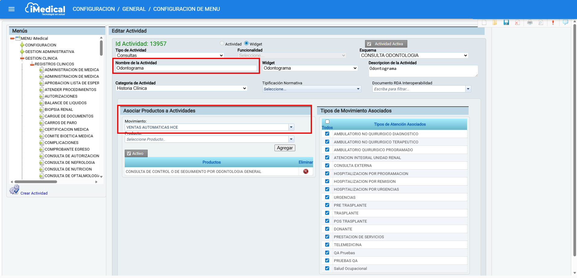 Al hacer esto, verifique en la sección "Asociar Productos a Actividades" que la actividad tenga seleccionado el movimiento de "Ventas Automáticas HCE", en estado activo.
