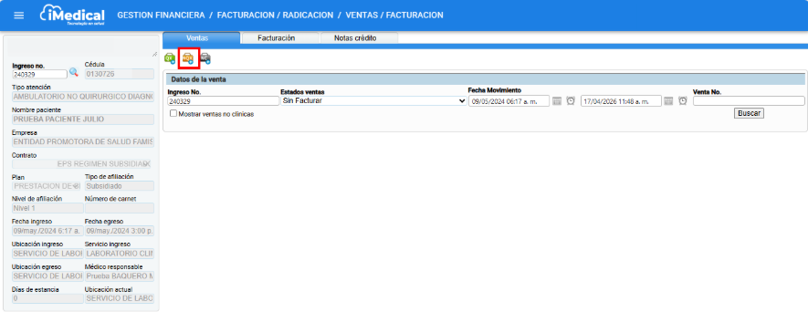 Una vez hecho el proceso anterior, Seguir la ruta: Gestión Financiera > Facturación/Radicación > Ventas/Facturación