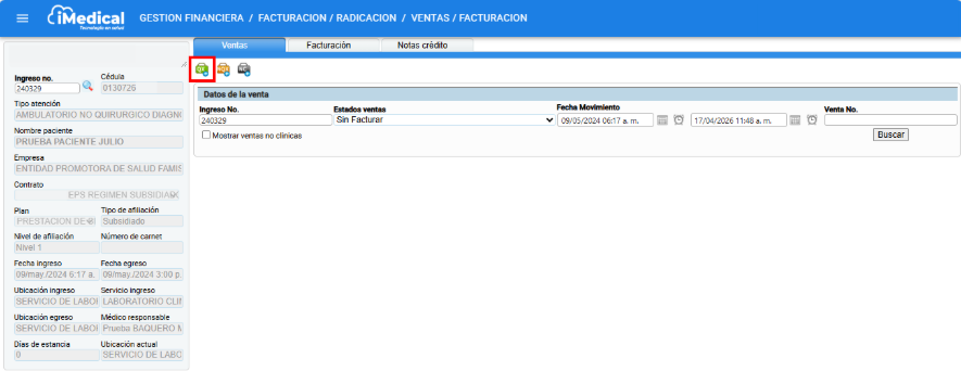 Una vez diligenciado el número de ingreso, se debe dar clic en el icono Ventas QX y se activa la pantalla donde se deben completar los campos necesarios.